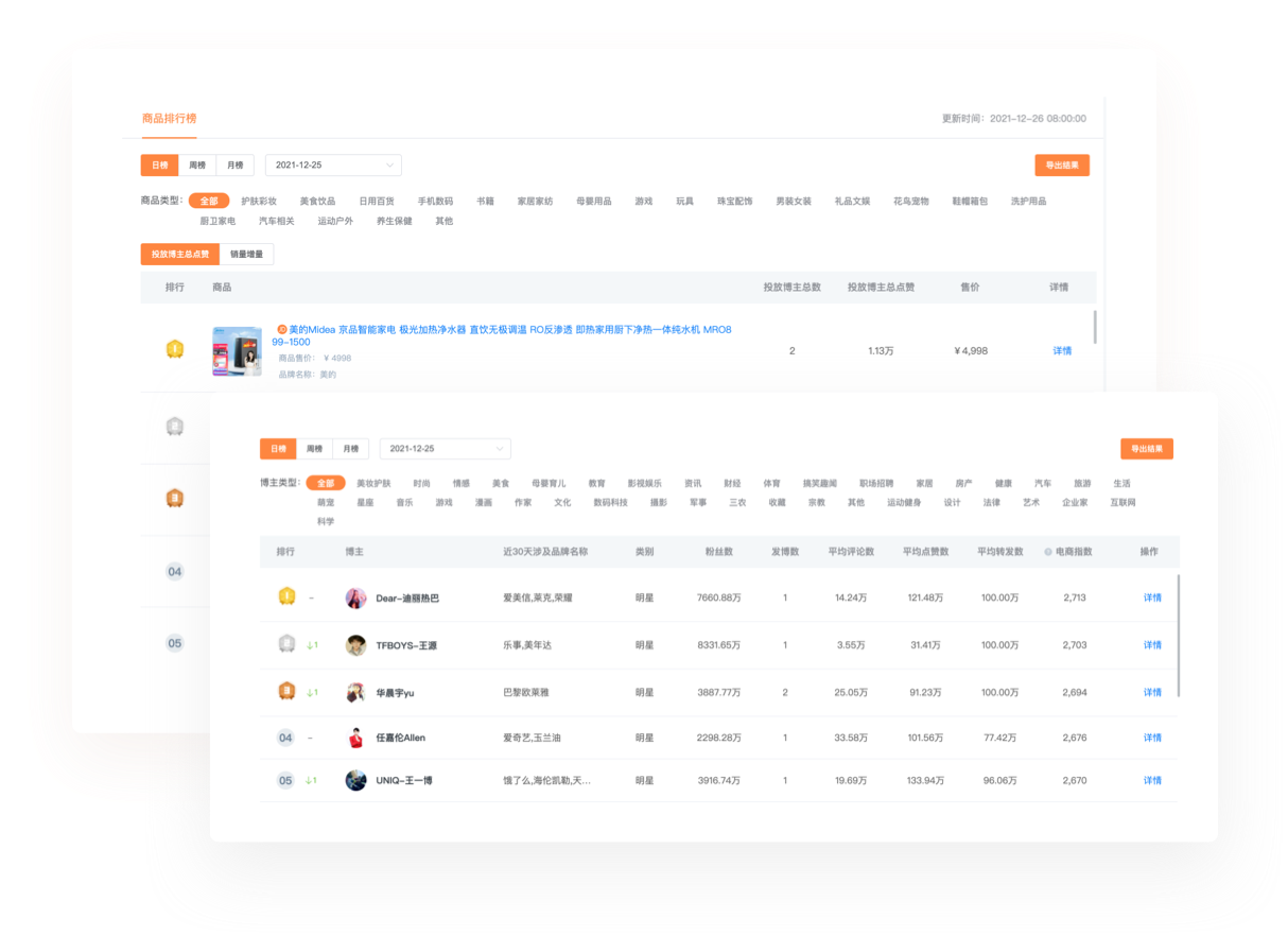 多項內容全面解讀達人,歷史內容追蹤,AI去水粉絲預估,智能算法評估達人價值,有效挖掘優質達人